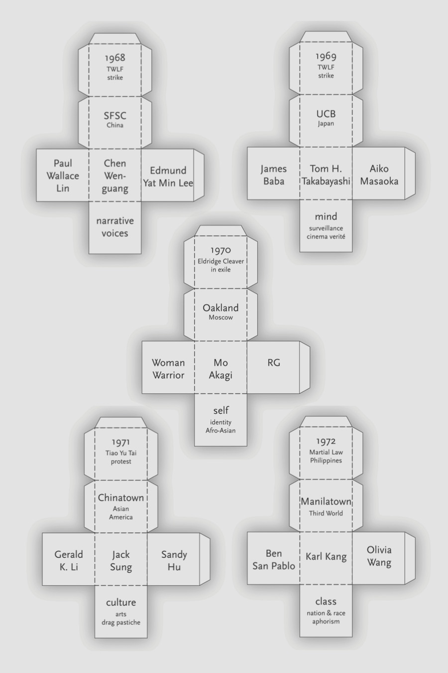 In the end, Yamashita “squished” the boxes, using the outline of a flattened cube to maintain a sense of architecture for the project, which she wrote as 10 linked novellas. The boxes line the inside covers of I Hotel, which has been reissued in a handsome 10th-anniversary edition by Coffee House Press. The book’s republication serves as an emboldening reminder of fiction’s ability to both transmit and embody transformational ideas. I Hotel is the extraordinary testimony of a revolutionary past, an archive whose flattened walls convey what is possible, both in politics and in art.