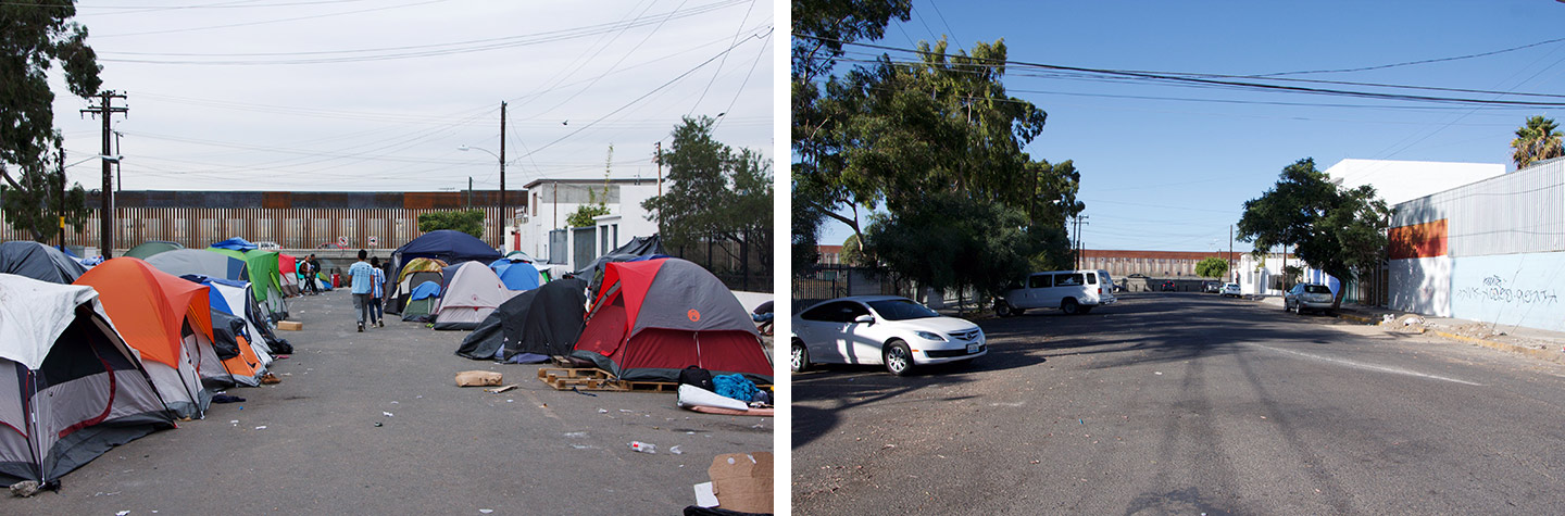 A year later, everything has changed. The hope that once sent thousands northward has largely been crushed. Back in Tijuana this fall, I found most of the shelters full not with Hondurans or Salvadorans, but with Mexicans—asylum seekers who told me they were fleeing cartel violence in the states of Michoacan and Guerrero. When I returned to the street where Marisol had pitched her tent, I found the scene unrecognizable: Where once there had been hundreds of other families, nothing remained. On the corner near where Marisol’s tent had stood, the flag had been washed away.