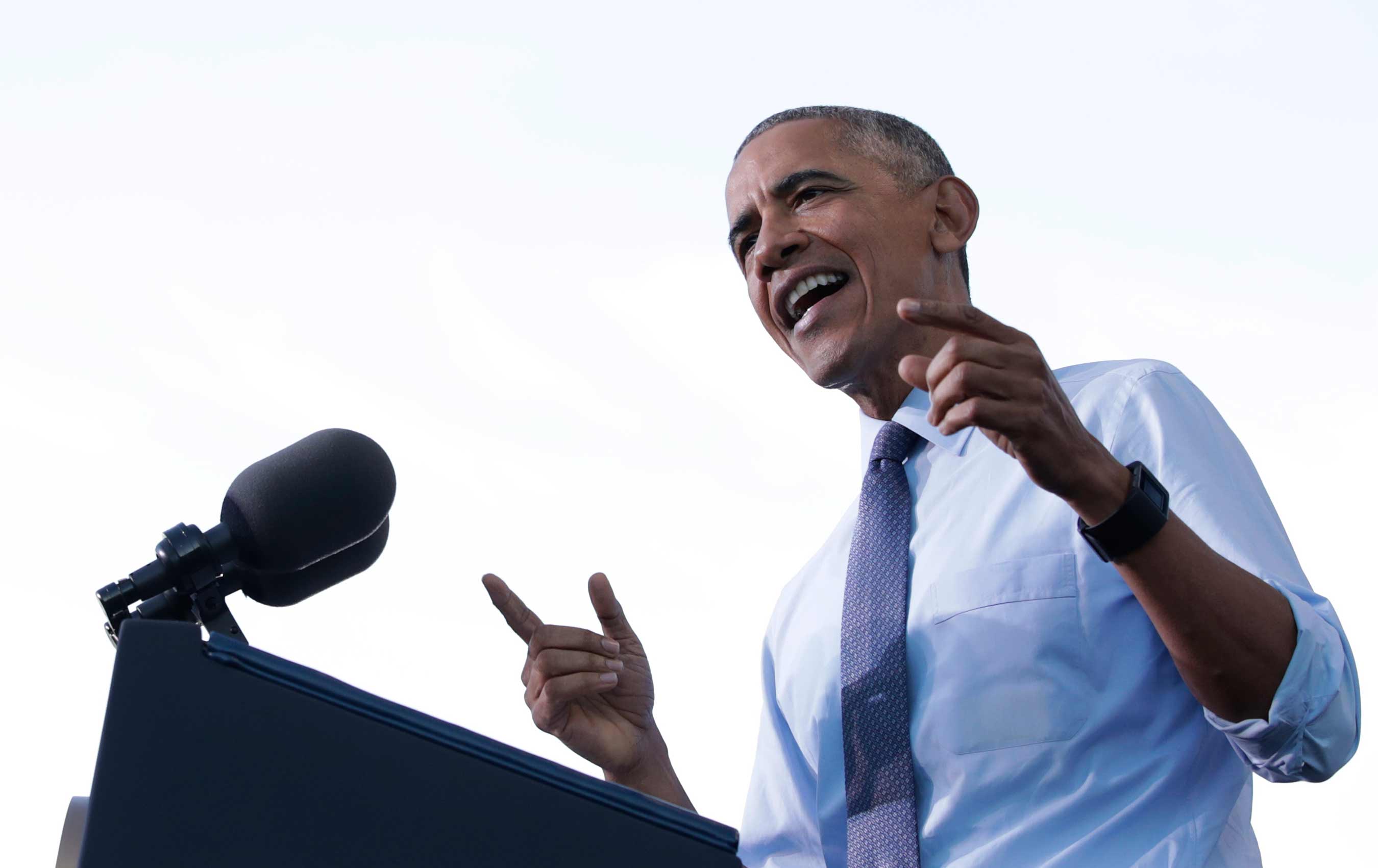 But Obama was grim and serious about the Trump threat, too. “When in the middle of a debate you threaten to put your political opponent in jail, that—no trial, no indictment, no lawyers…,” Obama said. “When you welcome Russian meddling in our electoral process, then you’re disregarding not just things like facts, or evidence, or a free press, but you’re chipping away at basic values like tolerance and due process and mutual respect.”
