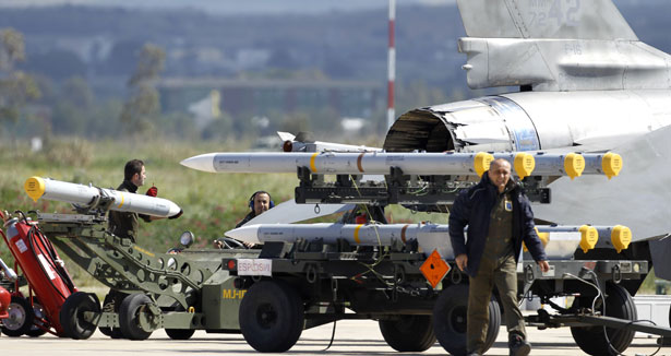 Ground crew transport weapons for an Italian F-16 Fighting Falcon at the Birgi NATO Airbase in Trapani in the southern Italian island of Sicily. (Reuters/Alessandro Bianchi)