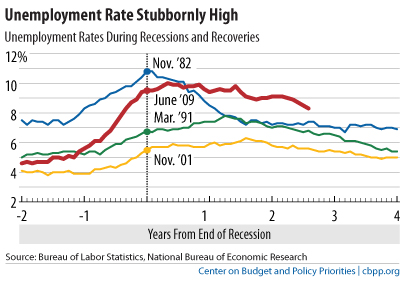 From the Center on Budget and Policy Priorities, here’s a graphic look at just how bad of a hole we’re in, in historic terms—and why we need job growth at much higher rates than even this month’s surprise: