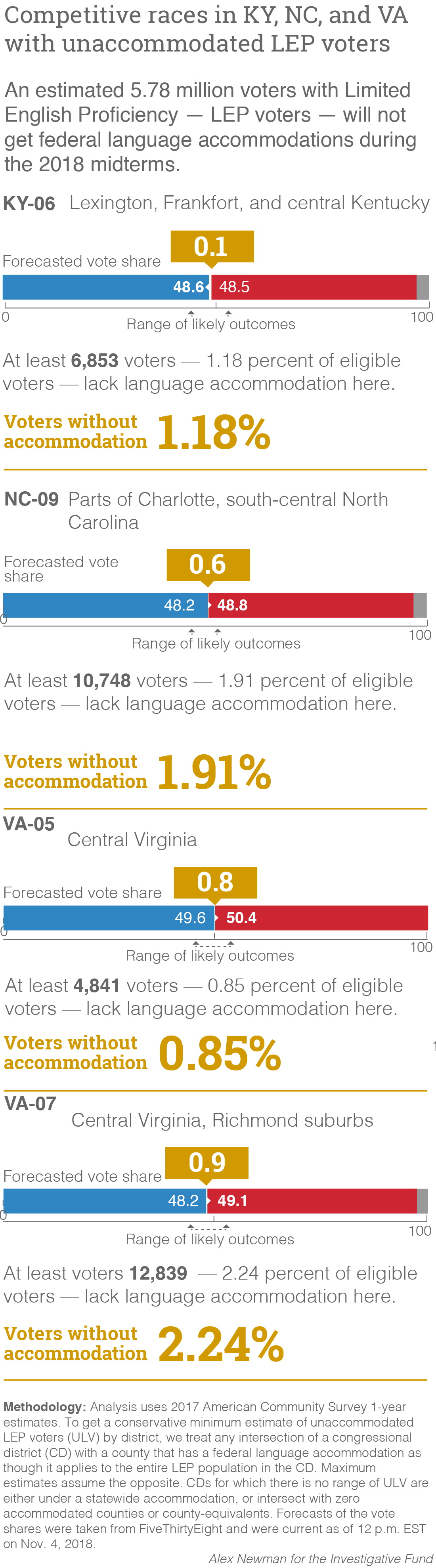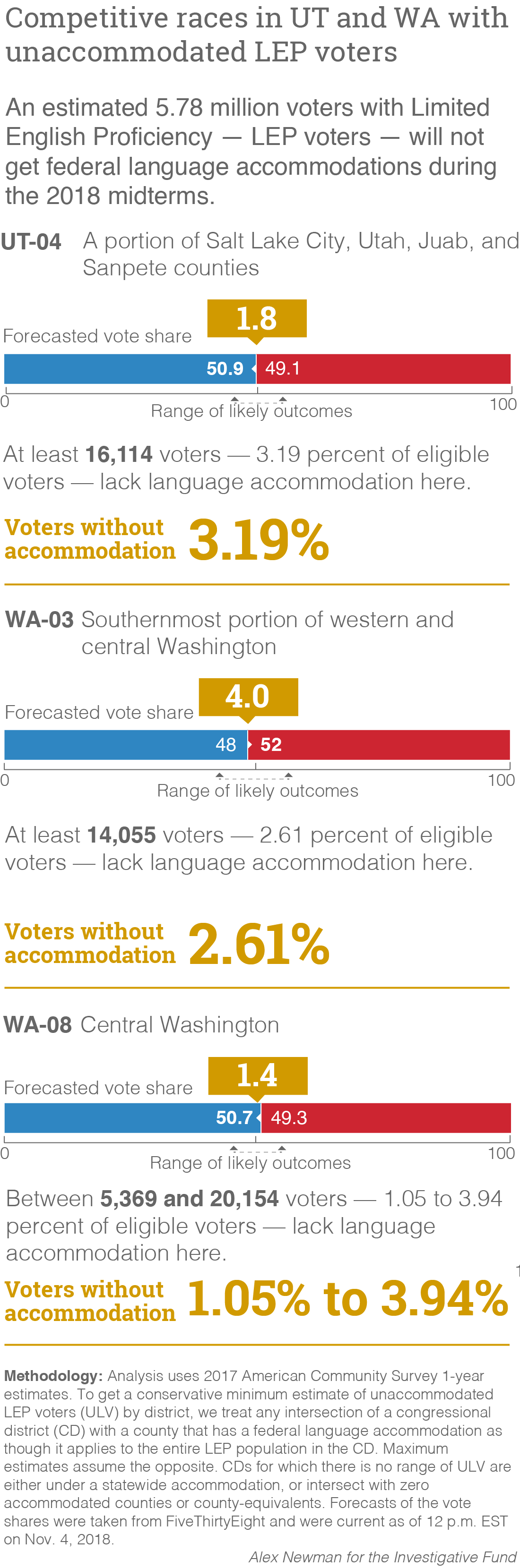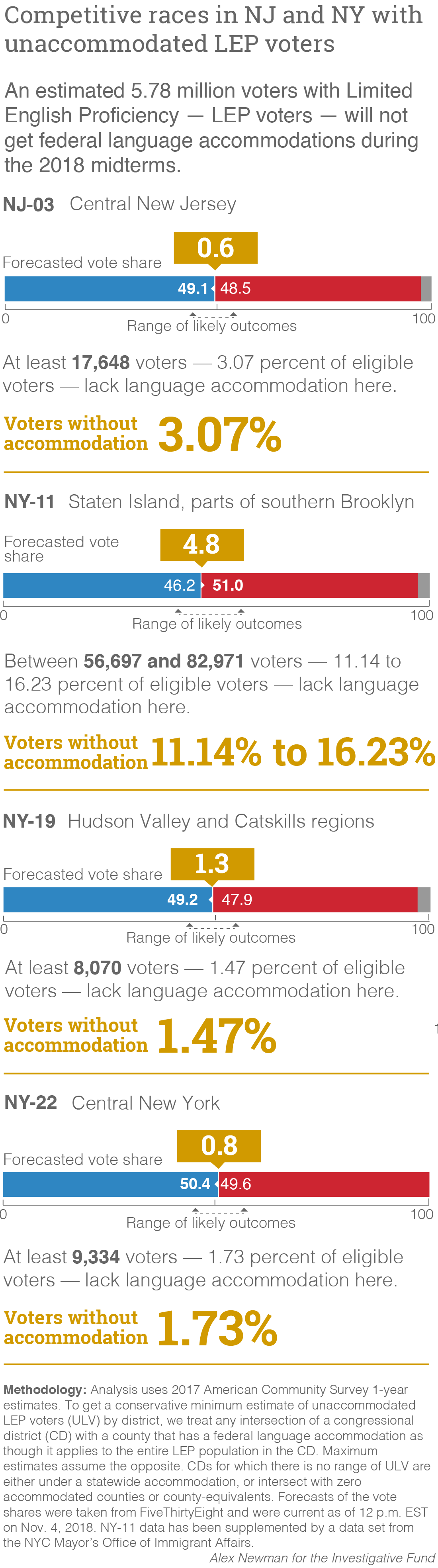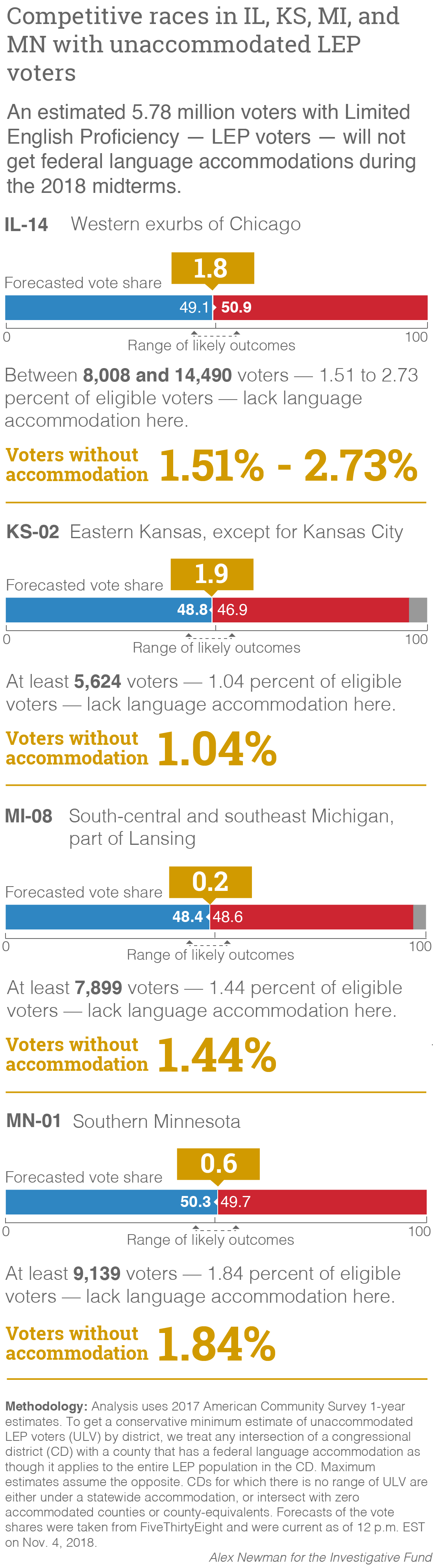 The Investigative Fund analyzed publicly available census data to identify Limited English Proficiency citizens over the age of 18. There are more than 11 million of them, and all are eligible voters unless their franchise is restricted because of a past felony conviction. According to calculations verified by the US Census Bureau, more than half of them are not covered by a federal accommodation. These LEP voters won’t all vote, and won’t all vote for the same political party, but, in the aggregate, they are a large enough group that language accommodation for voting could help swing 20 competitive congressional elections. Yet, outside immigrant-advocacy circles, few seem to have noticed.