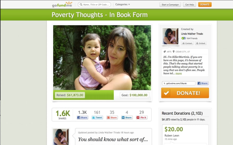 Last month, Tirado’s essay about poverty, “Why I Make Terrible Decisions, or, poverty thoughts”—originally written as a comment on a Gawker thread—went viral, and she was able to raise over $60,000 on GoFundMe to turn it into a book. On the cusp of a publishing deal, she’s been able to quit her job as a night cook at a cheap chain restaurant.