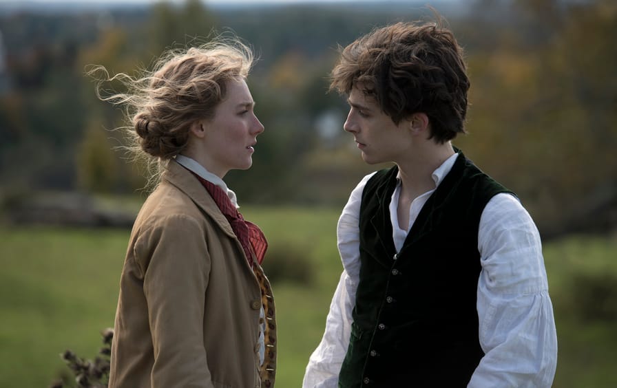 Unlike previous adaptations, Gerwig’s film begins in medias res: Grown-up Jo (Saoirse Ronan) is struggling to become a writer in New York City and returns home to Concord, Massachusetts, when she learns that her sister Beth (Eliza Scanlen) is seriously ill. The familiar scenes—balls, plays, Christmas breakfasts given away, disastrous haircuts—appear mostly in memories Jo recalls in between fitful bouts of sleep on her train ride north. The structure naturalizes the jumbled, episodic quality of the story as the product of a protagonist hurrying home; the new structure also helpfully introduces Professor Bhaer—whom Jo will marry—much sooner. Gerwig has chosen to depart from Alcott by casting Louis Garrel, who is young and sexy, as the professor; in the book, Alcott tells us, somewhat cruelly, that the character “was neither rich nor great, young nor handsome, in no respect what is called fascinating, imposing, or brilliant.”