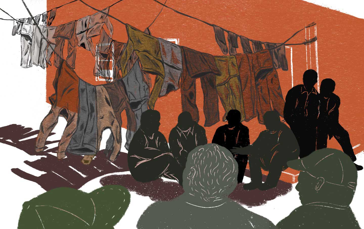 In this house there are 25 people. We all know each other. We get along. We all chat. Nobody gets out of hand, nobody looks down at other people. We walk a little when we have downtime, or talk to our families. Or just sit around. There’s no TV, but we listen to music, or just talk. We play soccer sometimes, but we don’t always have enough energy. I talk to my family every day. With these phones, it’s easy. I talk to my wife for twenty or thirty minutes a day, with my kids, too. Or we send messages to each other.