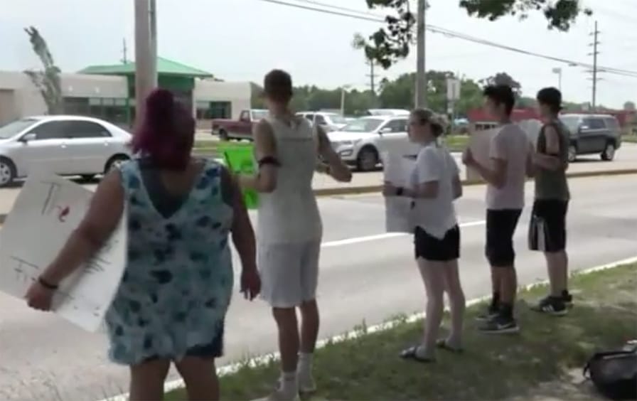 Hazelwood West class president Kyra Pearson was among the first to be suspended. She wore her graduation cords to the protest, a nod to the fact that her suspension meant she would be unable to attend graduation and read the speech she had prepared for the ceremony. Hazelwood West sophomore Jonel Harris, who wore his school’s Wildcat mascot costume at the protest despite the afternoon heat, said that his suspension would prevent him from seeing his older brother graduate. “Which is completely heartbreaking…. He’s always been my role model, the one I look up to and follow, and not being able to see him walk across that stage…” He paused, then added, “It’s one of the biggest things we’ve been waiting for for the past 18 years.” His sign read, “I can’t see my brother graduate now!” His friend Corey Johnson, a sophomore, held a sign that read “This is B.S. (bullying students)! #HSDWalkout.”