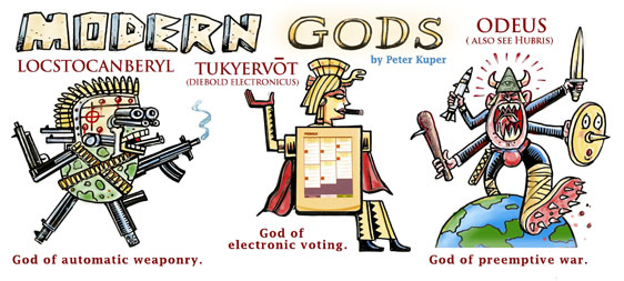 ColumnMarch 12, 2008Modern GodsModern Gods Peter Kuper Share Copy Link Facebook X (Twitter) Bluesky Pocket Email March 12, 2008 Keep Reading Ad Policy