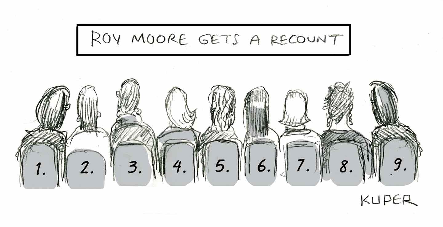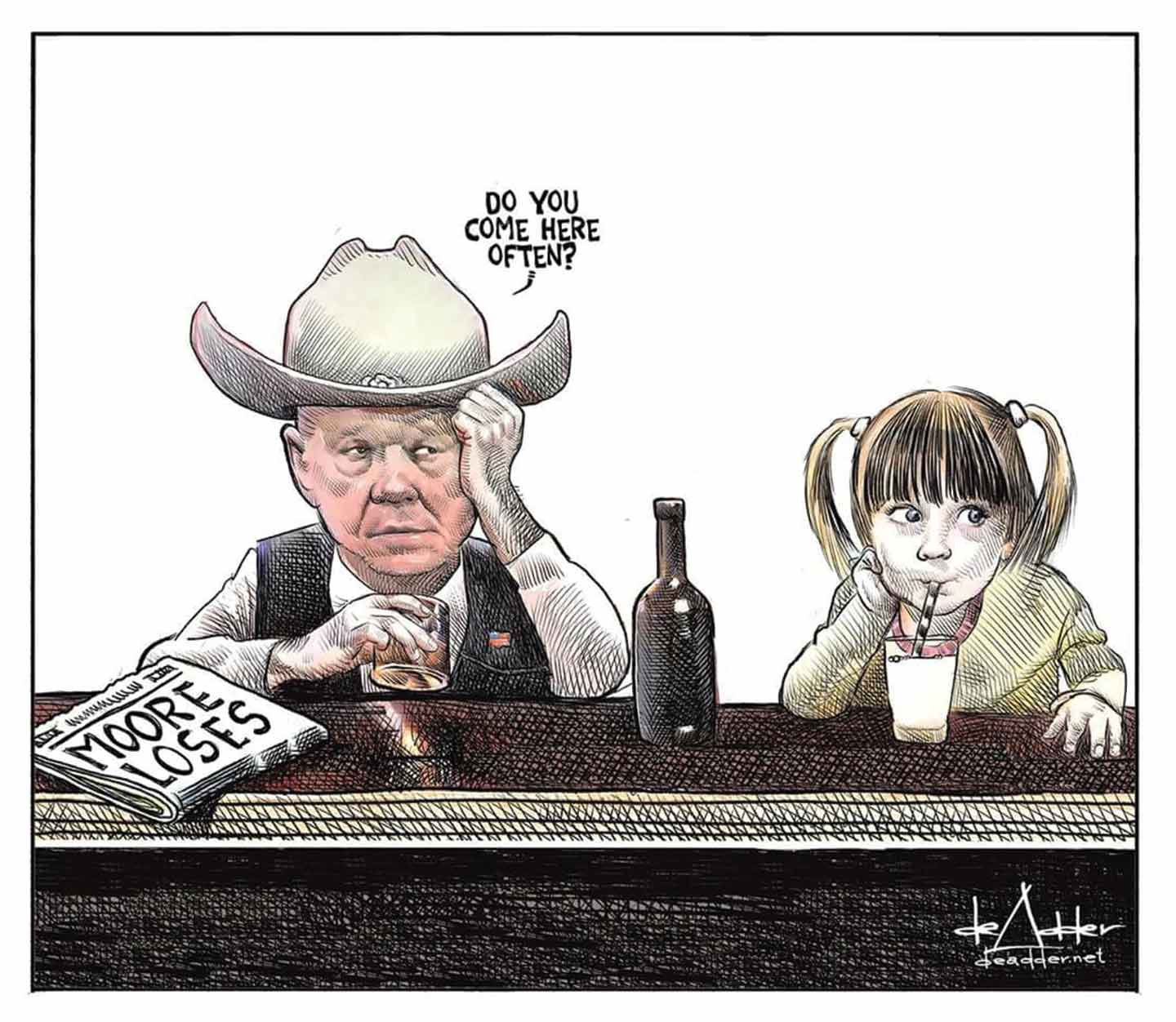 OppArtDecember 15, 2017Moore Is Less: Two Artists’ ResponsesMoore Is Less: Two Artists’ ResponsesRoy Moore rides off, leaving a trail of accusations. Peter Kuper and Michael de Adder Share Copy Link Facebook X (Twitter) Bluesky Pocket Email December 15, 2017 Check out all installments in the OppArt series.