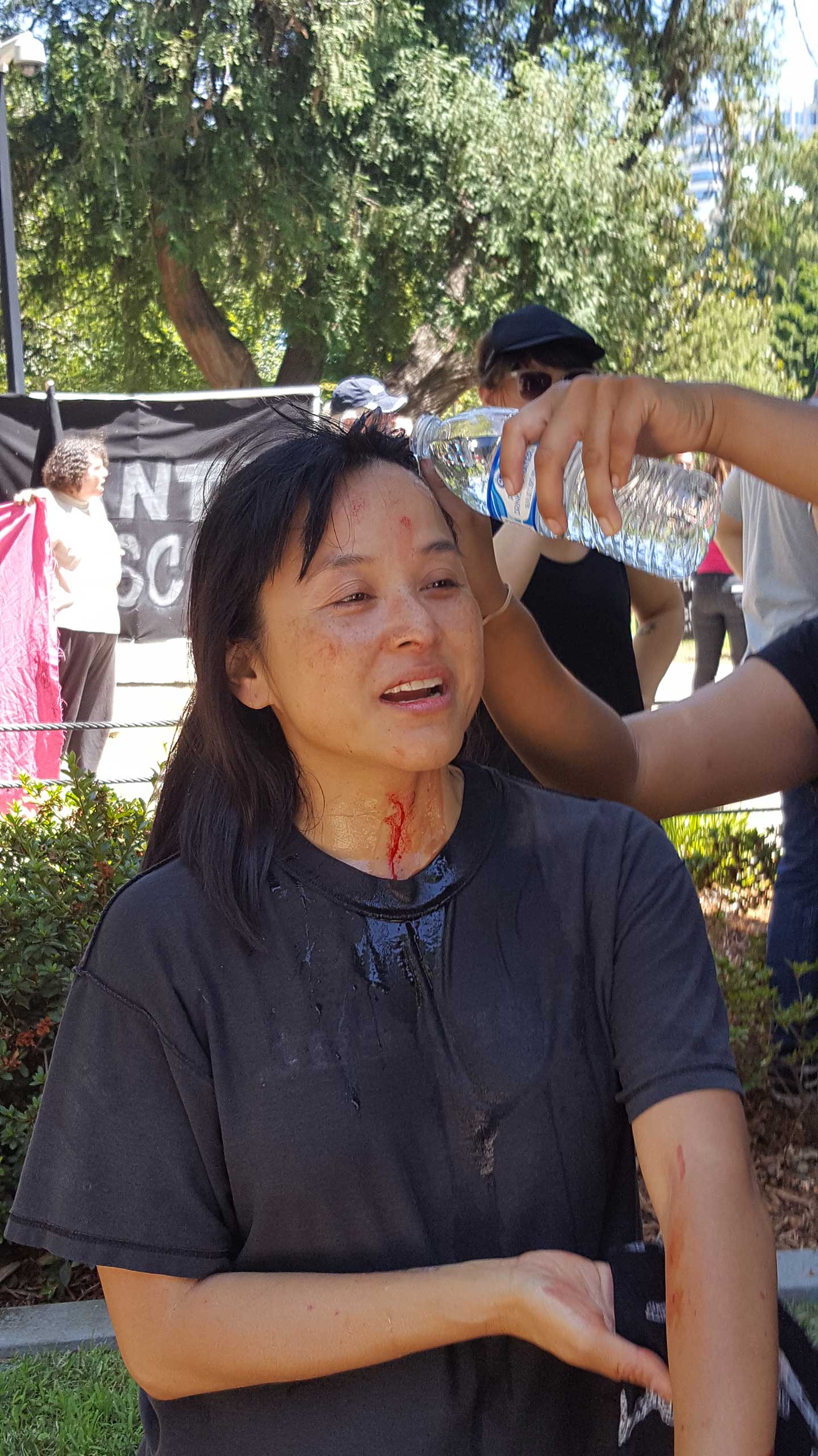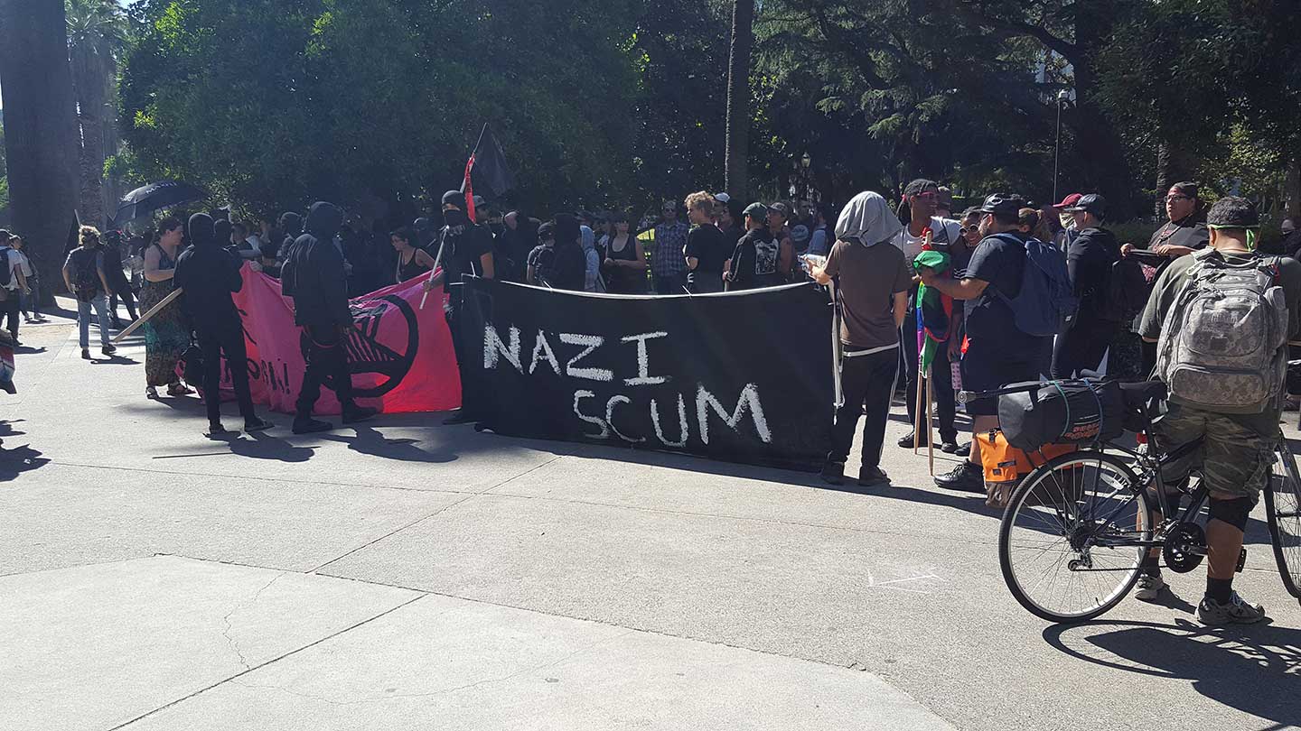 From 9am this Sunday, anti-fascist groups began gathering on the streets surrounding the capitol. There were people flying banners with traditional civil rights and anti-hate messages; individuals flying gay-pride banners; representatives from immigrant-rights organizations; and student activists from the local community colleges and California State University campus. But there were also an array of sectarian groups—masked anarchists, waving their black-and-red flag, many carrying sticks and makeshift Plexiglas shields—through to revolutionary organizations like the Marxist-Leninist Progressive Labor Party. These groups had come from as far afield as San Diego and Portland—and they weren’t aiming for a simple statement of disgust at the Nazis; rather, they were pledged to shut them down.