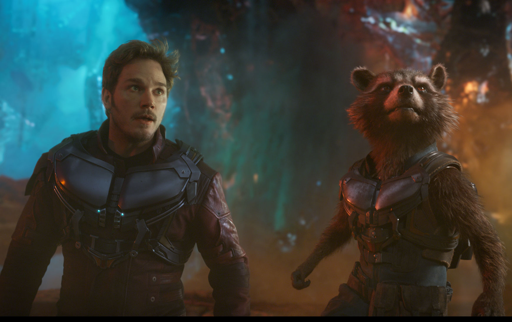But then, there are multiple family romances in this Guardians; almost everyone gets to have his, her, or its own emotional catharsis. On the one hand, this is appropriate for a series that has moved away from being the story of the straight white guy and is now realizing its destiny as a platoon movie on LSD. On the other hand, I’m disappointed: Guardians has become earnest in preaching forgiveness, reconciliation, comradeship, and half a dozen other virtues that are ill-suited to a movie that pretends to razz the whole superhero business. Leave it to Spider-Man to tell us that with great power comes great responsibility. In Guardians, an ill-tempered bionic raccoon is supposed to pull down responsibility’s pants. But Rocket, voiced by Bradley Cooper, now has the duty to live up to his own cinematic reputation—such are the snares of success—and his buddy Groot the talking tree has gone cutesy on us.