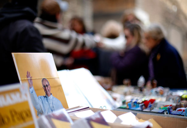 Prints of Pope Francis are seen in a newspaper kiosk near the Vatican March 15, 2013. Reuters/Max Rossi