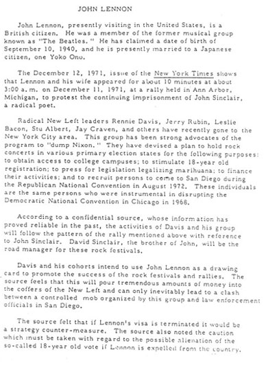 The story of Nixon’s effort to deport Lennon was told in the 2006 documentary The US vs. John Lennon and in the book Gimme Some Truth: The John Lennon FBI Files