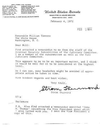 Timmons is known today mostly as a lobbyist for the oil companies, but in 1972 he worked in the Nixon White House as Assistant to the President for Legislative Affairs. Strom Thurmond, the segregationist senator from South Carolina, sent a letter to Timmons in February, 1972, as the Nixon White House was gearing up for the President’s re-election campaign. The letter informed Timmons that Lennon and his friends were “strong advocates” of a program to “dump Nixon,” and that Lennon was planning “to hold rock concerts in various primary election states.” The purpose of the concerts was political: “to stimulate 18-year-old registration” and to urge people to demonstrate against Nixon at the Republican National Convention. Thurmond’s memo to Timmons concluded, “if Lennon’s visa is terminated it would be a strategy counter-measure.”