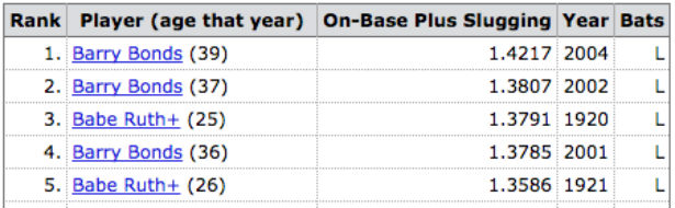 My feelings on this are well-known and have been for sometime. I think Barry Bonds is by a country mile the greatest player I have ever seen in person. Barry Bonds is the smartest, most controlled player with a bat in his hand in the last 50 years, and talking to the old-timers, only Ted Williams is in that conversation with him. Hall of Fame voters will probably say that Barry Bonds’ numbers are tainted. But dear Lord, look at those “tainted” numbers. Of the top five OPS in history (that’s the number drawn from combining your slugging percentage and on-base percentage), this is what it looks like as taken from baseball-reference.com: