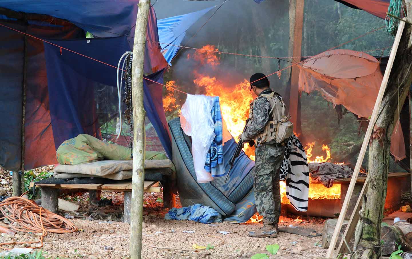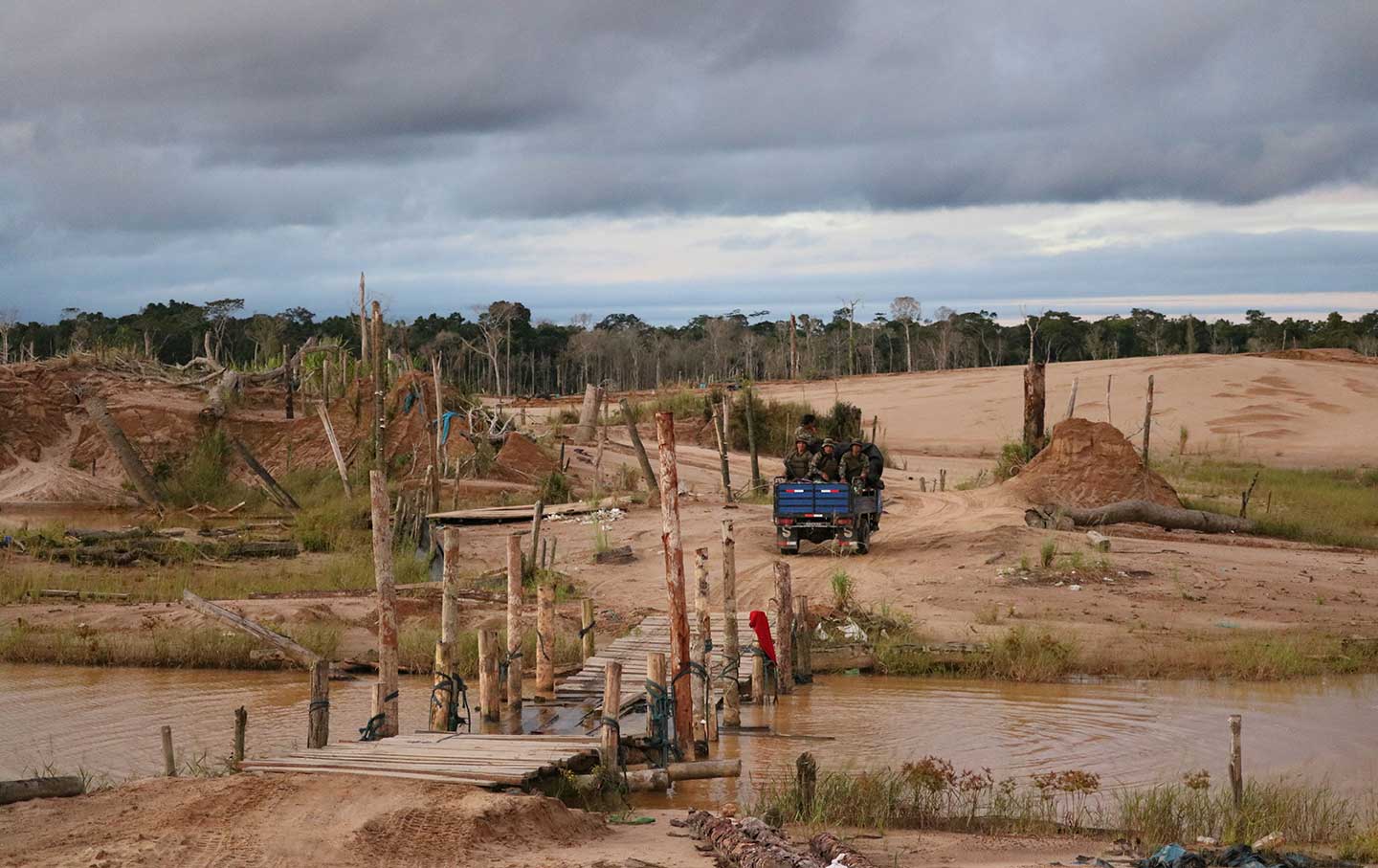 For now, the government will continue interdictions. And despite the state of emergency, miners still operate as covertly as possible. During one of the government’s stings, at a clearing with a few scattered lean-tos, soldiers flanked the huts with drawn pistols. The miners inside surrendered without a fight. One of them, a young man, led the officers to their nearby workstation: a raft covered with machinery sitting in a muddy, brown lake. For the next hour, officers scrambled down PVC pipes leading to the raft and strapped explosives to every visible piece of equipment until the dynamite was ready. During the detonation, a plume of dense black smoke surged into the sky. The raft was in flames, and the area reeked of burnt plastic and metal.