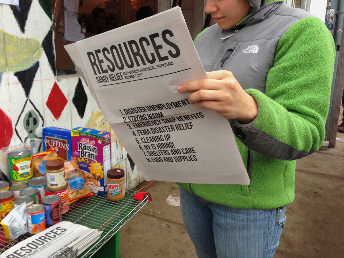 A Sandy Relief Resources newsletter was started recently by a few volunteers and distributed in South Brooklyn, South Queens (including the Rockaways) and Staten Island. The newsletter provides information about disaster unemployment and hiring opportunities, staying warm without heat, emergency snap benefits, FEMA disaster relief, cleaning up, shelters and care and food and supplies. Another similar publication that came out of the Occupy splinter organization Strike Debt is the Debt Resistors’ Operations Manual, which provides tips to those who will have to take out FEMA loans to rebuild their destroyed properties. As Murry put it, “the Occupy movement is a sort of organism—it generates cells that move out, bound by a broad supra-ideological consensus.”