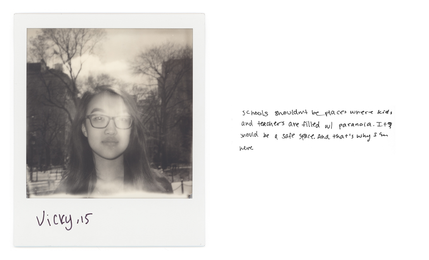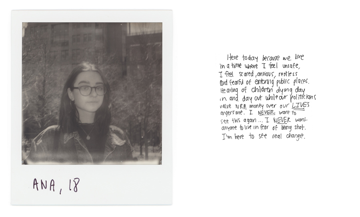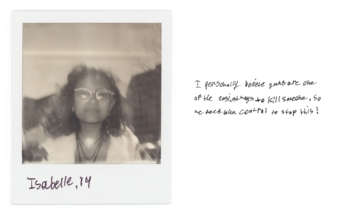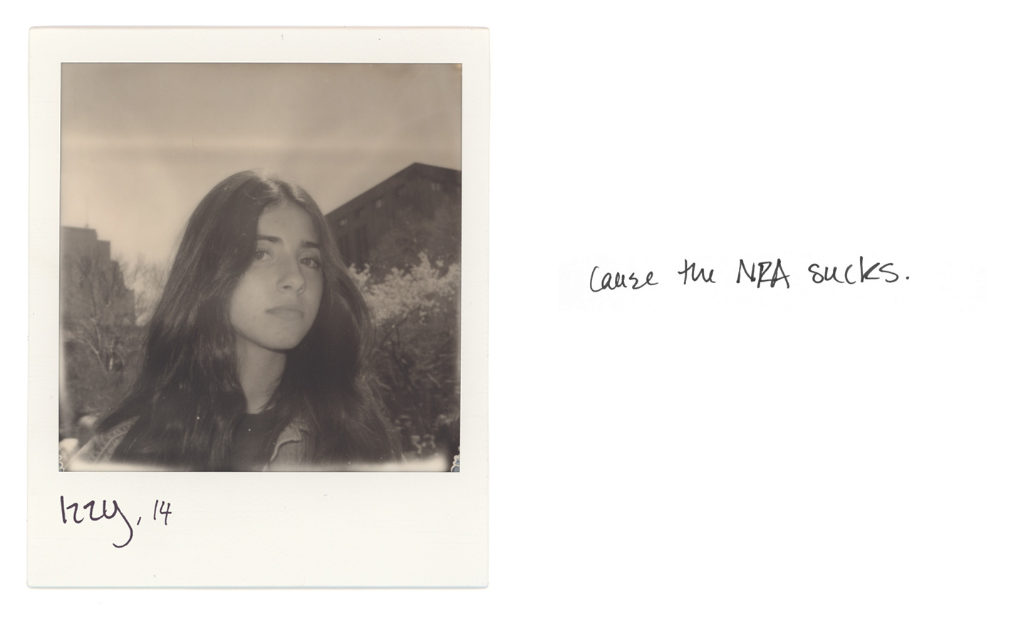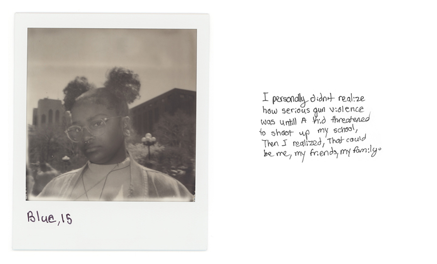 The most recent action was April 20’s National School Walkout, on the 19th anniversary of the Columbine High School Massacre, which saw thousands of students, from Portland to Austin to Richmond, take to the streets to demand action on gun violence. Photographer Tracie Williams joined a walkout in New York City to hear from the students themselves why they are joining this growing movement. “The Polaroids took a few minutes to develop,” Williams said, “which really allowed me the time to engage with the students in a meaningful way.” Williams asked the students to reflect on how they’ve been affected by gun violence, and what they want to see in their future. She found their answers to be tinged with anger and fear, but also full of hope.