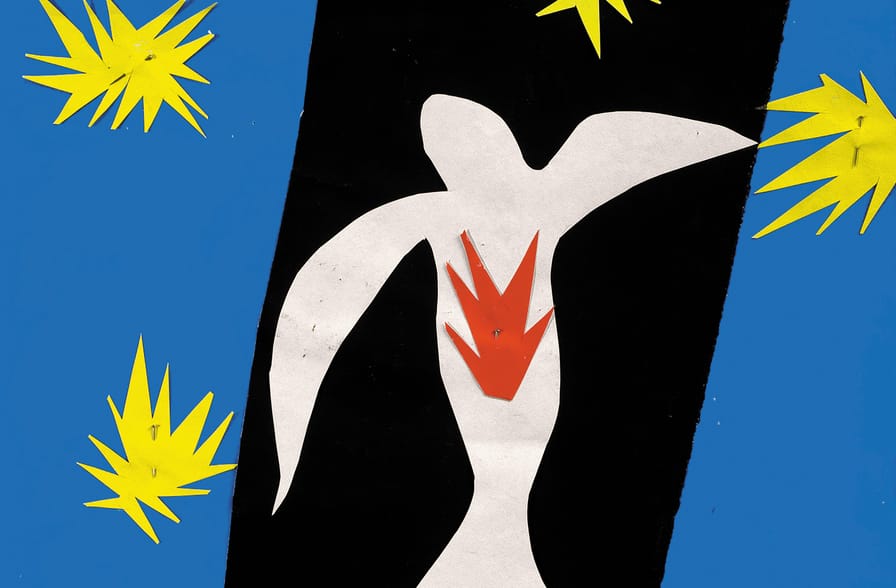 Summoned from the depths of wartime, this Icarus is not the earliest work in “Henri Matisse: The Cut-Outs,” the grand-scale exhibition on view at the Museum of Modern Art in New York City through February 8, but it is a crucial one. Matisse had used the cutout method—painting sheets of paper in gouache, then making cutouts pasted or pinned together—in the 1930s, but only to produce studies of things like stage curtains or book covers. The Fall of Icarus is different because it was made with no specific project in mind, though it inspired Matisse’s book project Jazz; it stands behind not only the book’s eighth plate, Icarus, but also its first one, The Clown. In 1943, Matisse was more inclined to make cutouts because, for an artist in his 70s who was physically challenged, the process was less taxing than oil painting. But it was precisely Matisse’s dissatisfaction with the book that led him to realize that the cutouts could be ends in themselves.