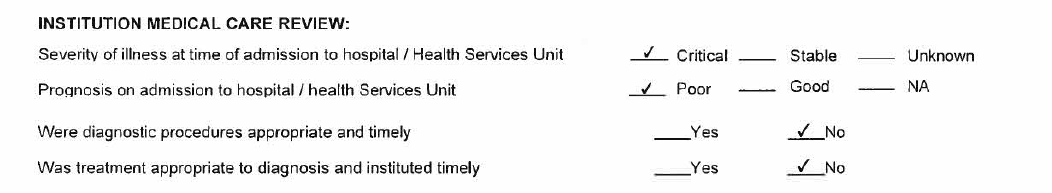 The prison’s mortality review, performed by the contractors, faulted both Austin and Amaru for failing to alert the clinical director or director of nursing when Garay’s condition did not improve under observation. Four medical doctors who independently reviewed Garay’s records said that both Amaru and Austin should have immediately ordered him taken to an ER, and the mortality review found that Amaru “did not respond correctly to the initial report from nursing describing new onset of presumed seizure of a previously healthy 41 year old male.” It also found that neither diagnosis nor treatment was “appropriate and timely.”