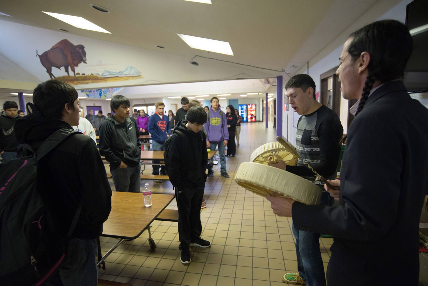 “How we do morning announcements—song, prayer, pledge—that’s how everyone is learning,” said Leora Kicking Woman, 18. “That influences the rest of the kids who used to be bad, not to be bad.”