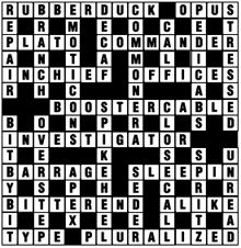 ACROSS 1 RUBBER + DUCK 6 anag. 10 rev. hidden 11 & 12 anag. 13 OFF + ICES 14 BOOS + TERCABLE (bracelet anag.) 19 IN(VE)STIGATOR 22 BAR RAGE 24 SLEE + PIN (rev.) 25 BITTE + REND 26 AL + IKE 27 hidden 28 anag.