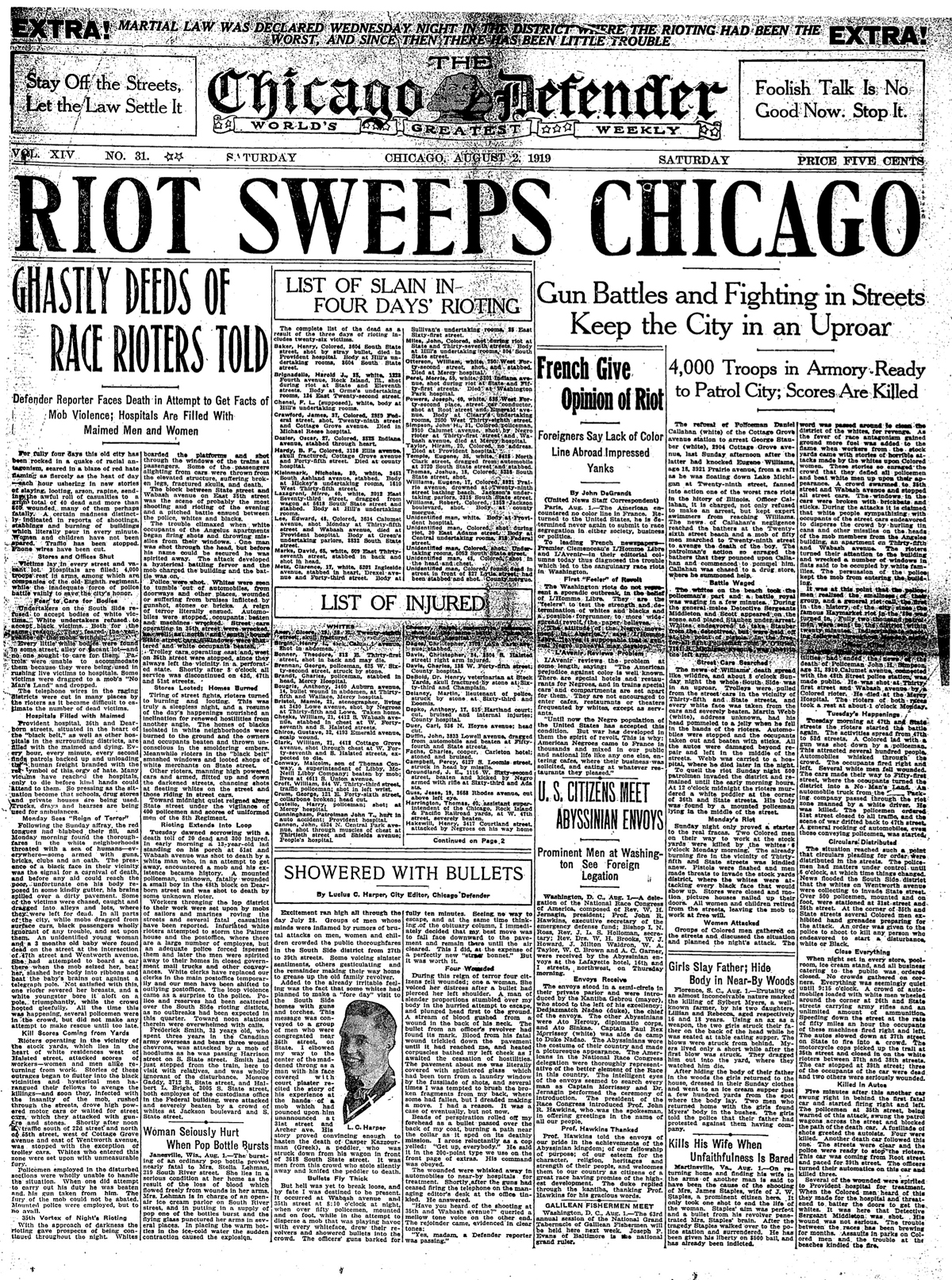 On July 27, 1919, a 17-year-old black teenager, Eugene Williams, and his friends accidentally crossed into the waters of the “whites only” side of what’s now the Margaret T. Burroughs Beach in Chicago. Williams’s homemade raft was pelted with stones thrown by a white beachgoer until the teen fell into Lake Michigan and, ultimately, drowned. Other scuffles between white and black beachgoers were inflamed when the first member of the Chicago Police Department to arrive at the scene refused to take the white culprit into custody and instead arrested a black man. This blatant failure to uphold justice kicked off a weeklong race riot that left 38 dead and over 520 injured, the majority of whom were black. The Chicago Race Riot terrorized the city’s black community, rendered about a thousand people homeless, and left deep racial rifts that persevere to this day.