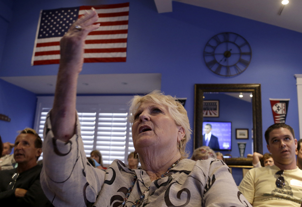 A presidential debate watch party put on by the South Orange County Tea Party in Dana Point, Calif. Wednesday, Oct. 3, 2012. (AP Photo/Chris Carlson)