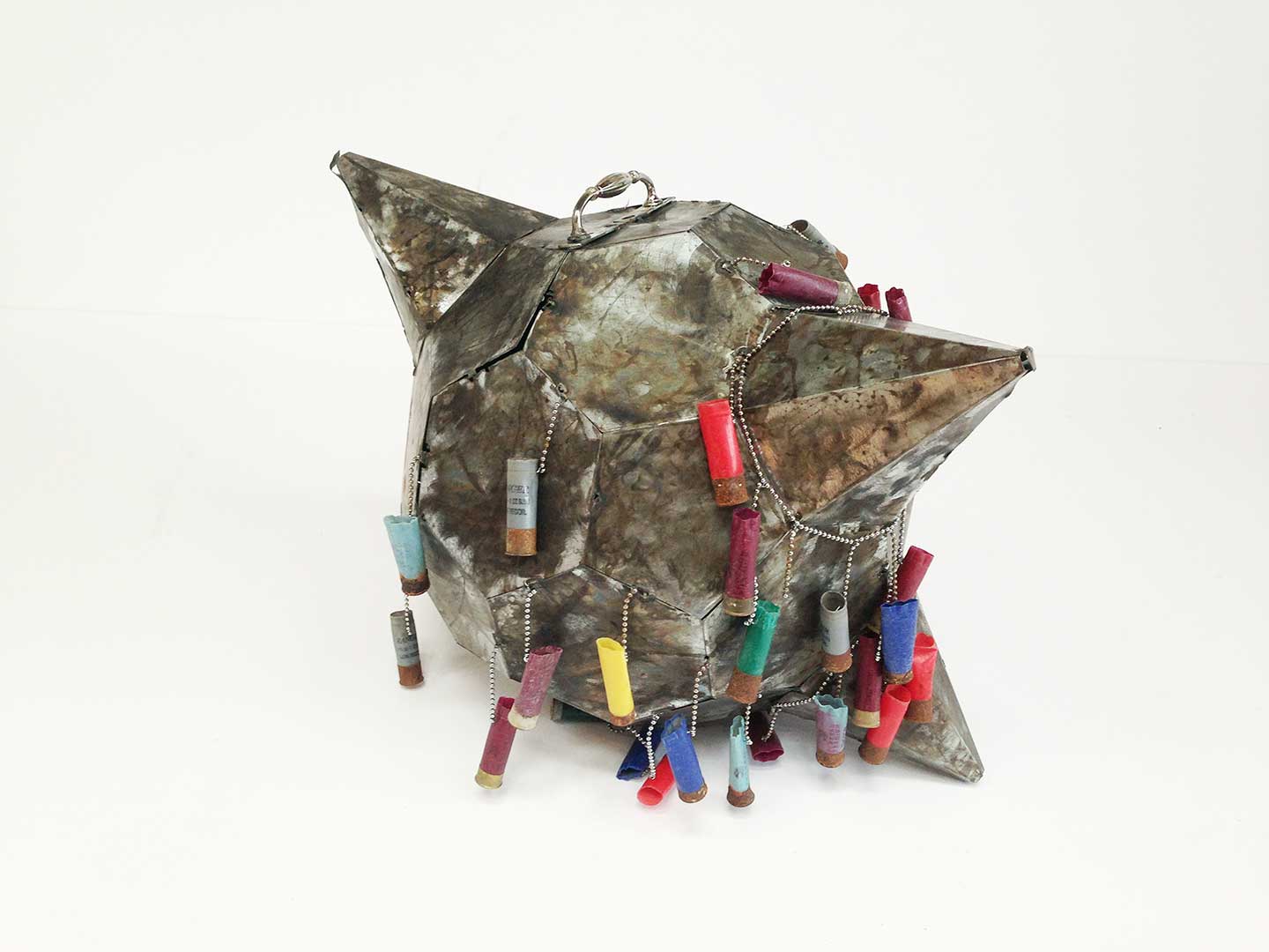 There may be snatches of beauty in human folly—and Misrach brings them out in photos of the wall’s silent denial of humanity—but fear, drama, and human pathos come to the surface in Galindo’s sound installations. In one example, a piñata (inspired both by a Mexican soccer ball found stranded on the US side of the wall and the West African instrument called a shekeré) is gaily festooned with spent shotgun shells. Galindo is a self-described “sonic architect, performance artist, and Jungian Tarotist,” as well as composer and performance artist, from Mexico and currently a professor at California College of the Arts in Oakland.
