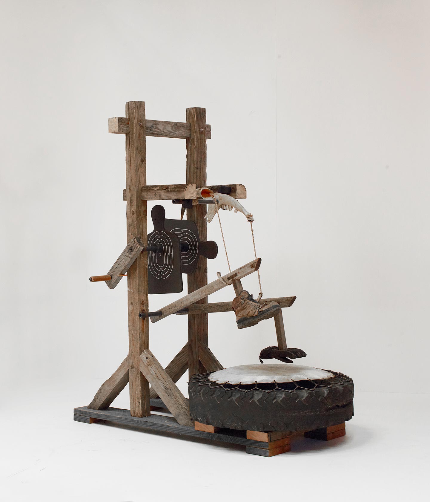 In his work, harking back to pre-Colombian musical traditions, he creates “cyber-totemic” objects in which “there is an intimate connection between the sound of an object and the material” from which it is made. The strange catapult/torture-looking device he calls a “Zapatello” embodies this raw intimacy between substance and sound. Maybe as hard to describe as it was to construct, Galindo’s Zapatello is an homage to Leonardo da Vinci’s Martello a Camme, basically a “mechanized hammering machine,” with two drumsticks made out of a found migrant shoe and glove, a Border Patrol drag-tire as the drum head, human-shaped targets as gears, plus a donkey jaw and a ram’s horn that work as the gear-stops.