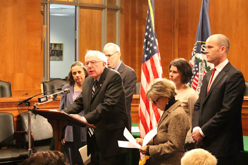 Senators Bernie Sanders and Barbara Boxer, along with representatives of many mainstream environmental groups and think tanks, announce comprehensive climate change legislation, February 14, 2013, on Capitol Hill. Photo by George Zornick.
