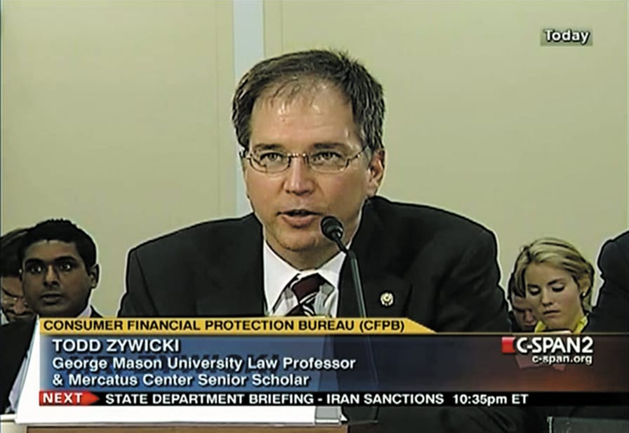 Zywicki’s withering arguments against financial reform have earned him guest columns in The Wall Street Journal, The Washington Times and on The New York Times’s website. Lobbyists representing the largest consumer finance companies in the country have cited his writings in letters to regulators, and the number of times he has testified before Congress is prominently displayed on his academic website at the George Mason University School of Law.