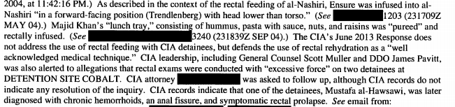 Forced rectal hydration—that is, the insertion of liquids and nutrients into a detainee’s rectum against his will. This can at times be used to treat malnourished patients who are unable or unwilling to eat, but the report makes clear the CIA ordered rectal procedures when it wasn’t medically necessary as well: