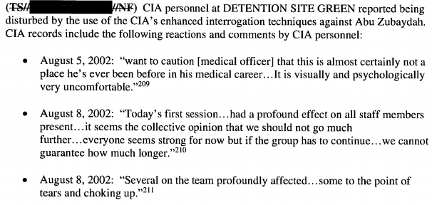 Not only did torture not reveal useful information, it sometimes sent the CIA on wild goose chases, the report found: “multiple CIA detainees fabricated information, resulting in faulty intelligence. Detainees provided fabricated information on critical intelligence issues, including the terrorist threats which the CIA identified as its highest priorities.”
