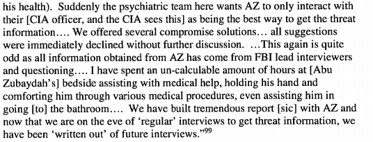 That’s not to say he didn’t have information about other people involved in plots against the United States, and things that happened in the past—but materials obtained by the Senate investigators reveal how Zubaydah was willingly giving FBI agents this information under no duress while he was in the hospital recovering from gunshot wounds that occurred during his capture.