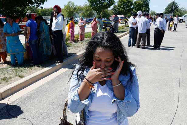 A woman reacts with others as they await word on a shooting at a Sikh temple in Oak Creek, Wisconsin, Sunday, August 5, 2012. (AP Photo/Jeffrey Phelps)
