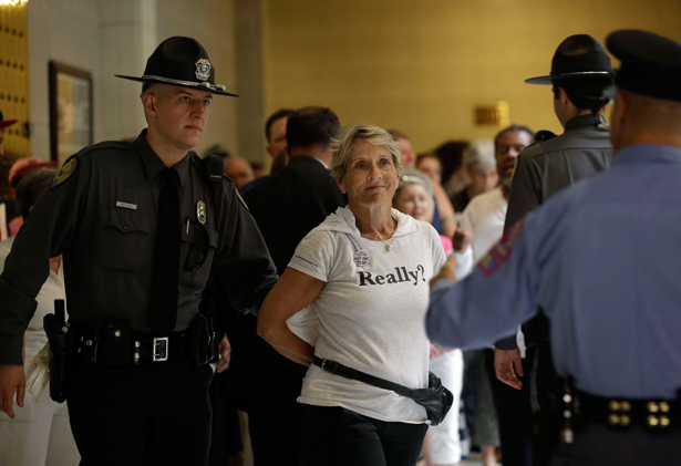A woman is arrested as protesters rally during “Moral Monday” demonstrations at the General Assembly in Raleigh, North Carolina, Monday, July 8, 2013. (AP Photo/Gerry Broome)