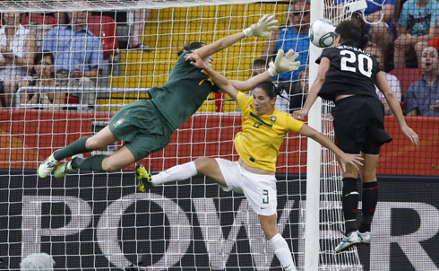 Abby Wambach of the US scores against Brazil’s goalkeeper Andreia Suntaque and defender Daiane Menezes Rodrigues during the Women’s World Cup quarter-final in Dresden, July 10, 2011