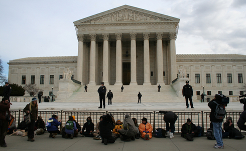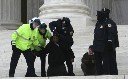 Several protesters were arrested at Occupy the Courts for violating federal law barring political action on Court grounds.