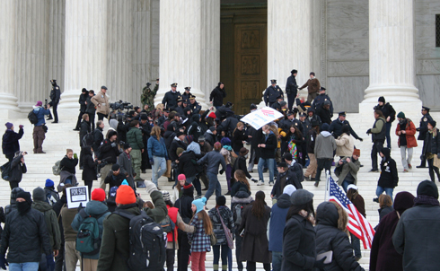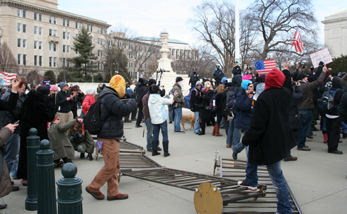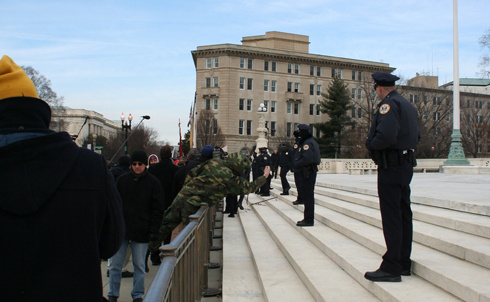 In anticipation of mass civil disobedience, Supreme Court police sealed off all access to the plaza in front of the court with heavy metal barricades.