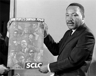 Horace Cort/Associated PressMartin Luther King Jr. displays the Poor People’s Campaign poster on March 4, 1968, in Atlanta.