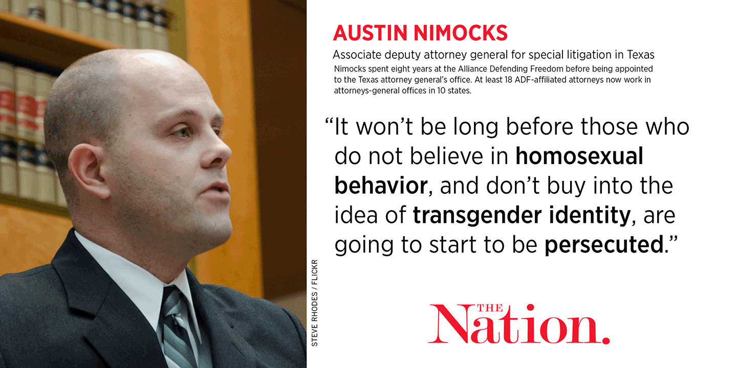 Today, Nimocks is a top litigator in the office of the Texas attorney general, along with two other former ADF attorneys, David Hacker and Heather Hacker. There, Nimocks has played a leading role in two legal challenges to Obama-era rules protecting transgender rights, in which the Texas AG’s office led a consortium of attorneys general from other states. Each time, Nimocks’s team won nationwide injunctions: one against a Department of Education guidance protecting transgender students’ rights in public schools, and the other against an Affordable Care Act rule prohibiting discrimination against transgender people in health care. The education ruling represented a significant victory for ADF, which had been fighting both the Obama guidance and the school districts that adopted it, claiming that it “[put] the privacy and safety of children at risk.”