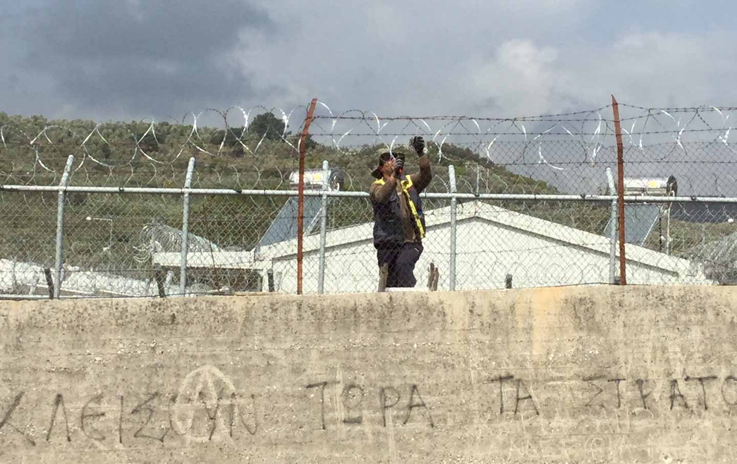 Further along the fence we met a group who seemed tormented and distraught. “There is a hunger strike inside here,” they told us, and showed us pictures of families in tents next to the fence and small children lying on the ground outside. A Syrian man stressed that there are no lawyers, that no one knows what they are supposed to do: “They fingerprint us, and we do not know what for.… I have been here for 22 days now. A man was hit the other day by the police because he stood in line for food twice.… A few days ago, there was a fight among the detainees, and one was hit on the head with a metal bar. He was taken to hospital and has not come back.”