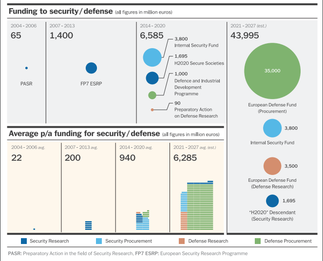 Sedou’s letter describes the wider militarization of all aspects of the EU budget. Besides the billions of euros the EDAP was proposing to syphon directly to the military industry, she wrote, the EU was working toward facilitating the access of arms producers to a range of EU funding opportunities, including structural funds, development aid intended to alleviate poverty, and even Erasmus, the EU program for education and training: “Already in January 2017 a call for proposals launched under Erasmus includes defence as one of six priority areas.” Even without the diversion of subsidies earmarked for peaceful purposes, if Juncker’s budget projections hold, the direct allocation of EU funds to military contractors and their homeland-security subsidiaries will have exploded from zero in 2004 to tens of billions of euros by 2020.