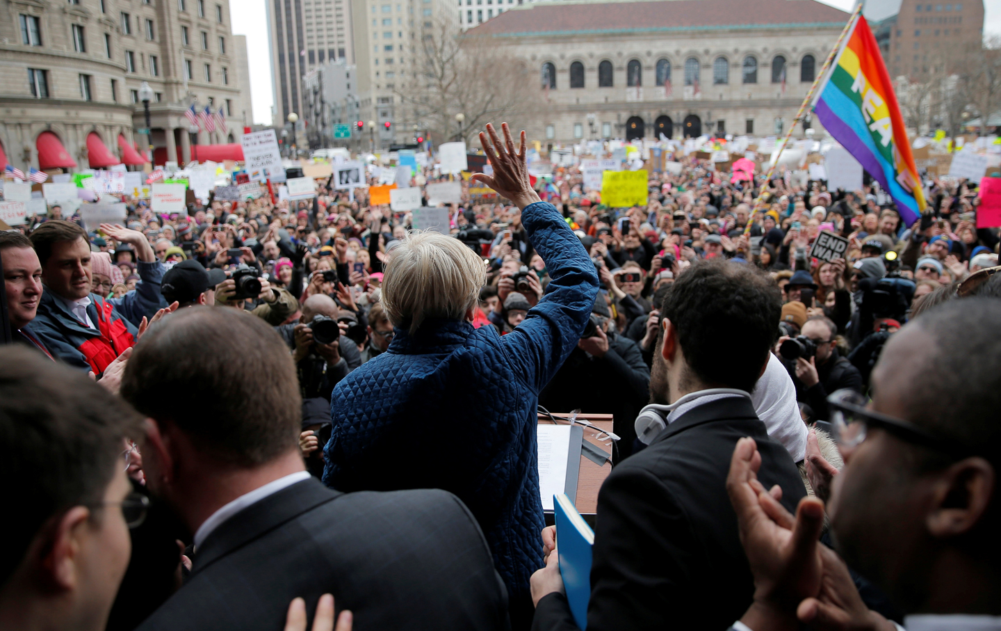 And who knew that once they marched, they’d discover they liked it, and would spontaneously march again in less than a week to protest Trump’s unconstitutional Muslim ban? As news broke about the number of people being detained at airports around the country—Iraqi military interpreters, Syrian refugee families, elderly Iranian grandparents, all of them with legal travel documents—lawyers and protesters surged to those airports. Soon, the politicians followed. Senator Cory Booker headed to Dulles Airport to try to negotiate some legal representation for the detainees, but Customs and Border Protection officials refused to even meet with him. Senate minority leader Chuck Schumer held a press conference with the family members of detainees, at which he broke into tears (drawing Trump’s mockery the next day). And Warren rushed to Logan Airport, where, over an Occupy-style human microphone, she decried the ban as illegal and unconstitutional.