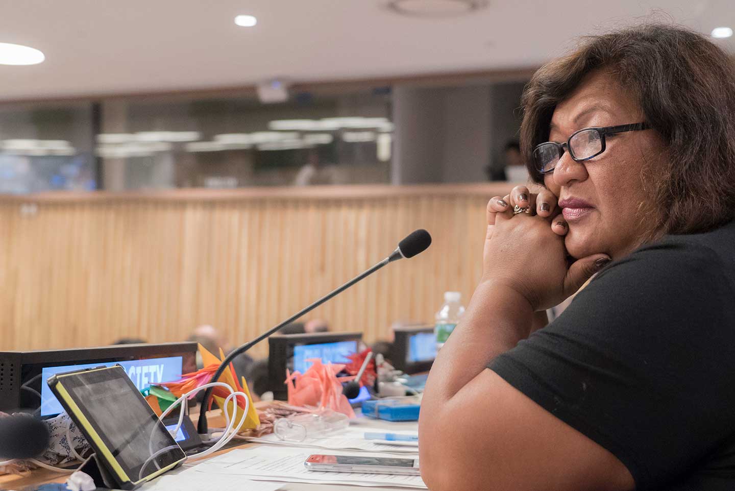 Abacca Anjain Maddison hails from Rongelap, an island that will remain uninhabitable for generations because of radioactive contamination caused by nuclear testing conducted in the Pacific. A former senator of the Republic of the Marshall Islands, she travels the world with ICAN, gives voice to the survivors of the nuclear testing in the South Pacific, and aims to get compensation for the damage done to her land.