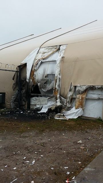 As the sounds of the bangs from the grenades and guns carried down the blowing alley, inmates in other pods began to leave their beds, peering out the windows. In a nearby pod, prisoners shouted at an officer to get away from the door and let them out. The officer refused. They too began to cut through the Kevlar walls. “I announced it on my radio,” the officer told me, “and then right when that happened, I heard everyone else saying that [inmates] were getting out of the tents. It didn’t take more than 5 minutes.” An order to the officers in all of the tents sounded over the radios: “Get out if you can.”