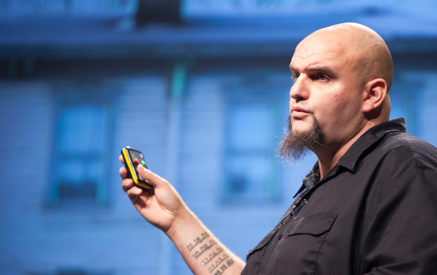 Meet John Fetterman, mayor of Braddock, Pennsylvania. An unconventional candidate in this “all bets are off” year of 2015. He’s in NYC to do Chris Hayes’s show, talk to some local radio hosts, and do some small donor fundraising. (In that MSNBC interview, Hayes begins by noting, “You don’t look like a freak but you stand out in a crowd.”) Fetterman fills my Nation office with his 6’8” tattooed frame—as if his devotion to the town is literally written on his body. In fact, Fetterman shows me his tattoos on one arm of Braddock’s zip codes, on the other the dates marking murders of the town’s citizens during his time as mayor. We meet the very week Fetterman has announced his candidacy for the Senate.
