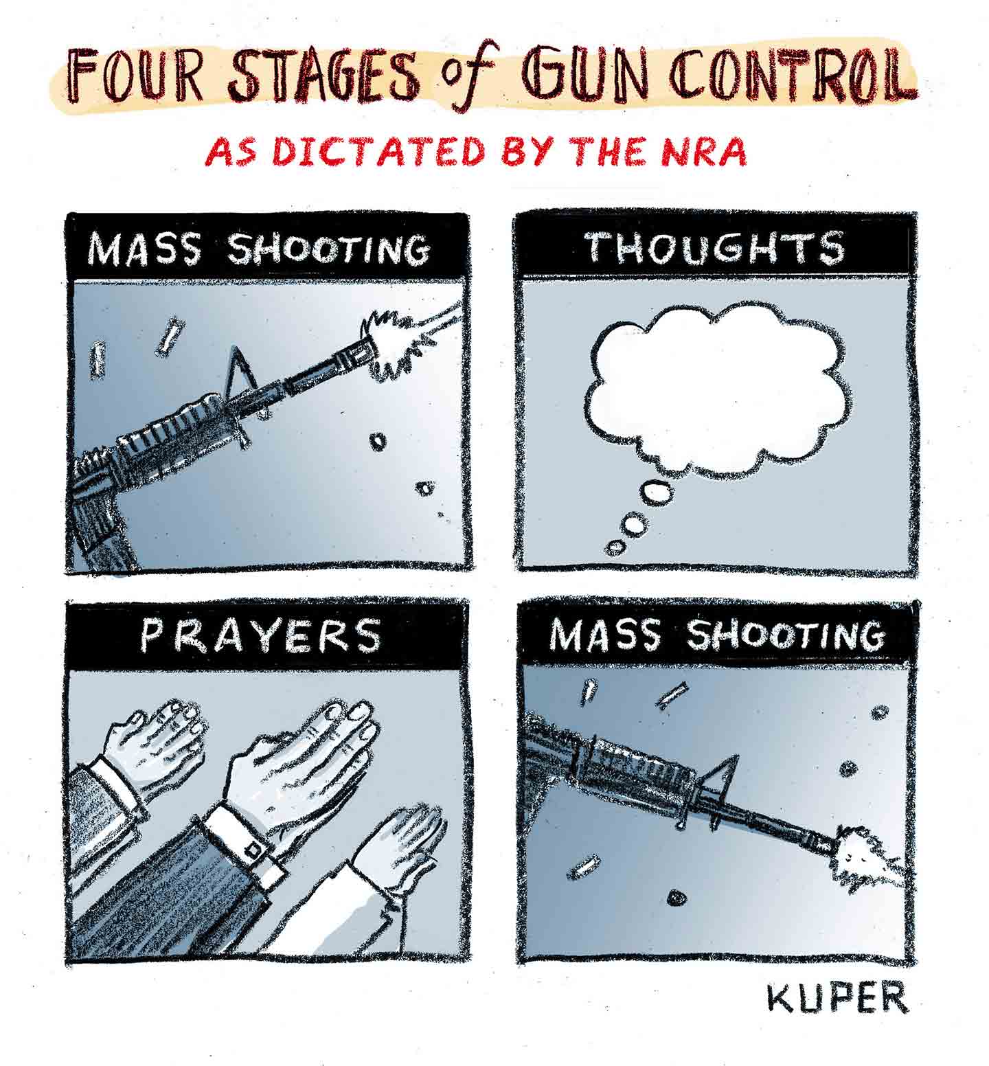 OppArtApril 16, 2018Thoughts and Prey-ersThoughts and Prey-ersTime to end this NRA hostage crisis. Peter Kuper Share Copy Link Facebook X (Twitter) Bluesky Pocket Email April 16, 2018 Check out all installments in the OppArt series.