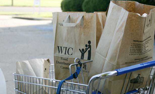 Grocery bags loaded with food from the Special Supplemental Nutrition Program for Women, Infants and Children, better known as WIC, sit in a cart before being loaded into a vehicle in Jackson, Mississippi, Thursday, October 3, 2013.