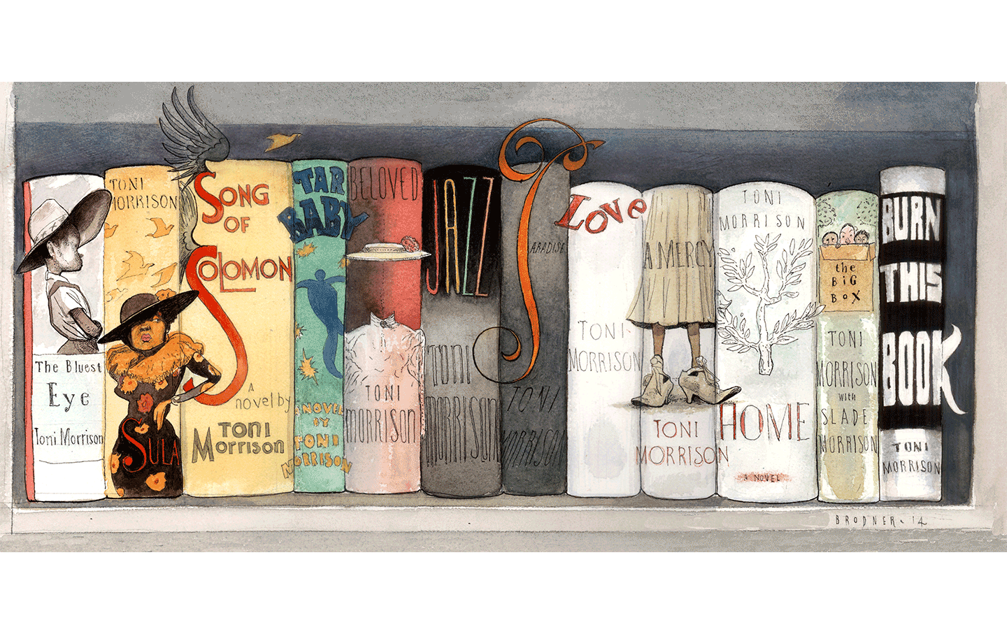 Drawing a legend. In 2014 The Nation asked me to draw a piece to present to Toni Morrison at a tribute to her at the annual dinner. Ms. Morrison, I was led to understand, did not like portraits, so I rendered her titles. Turned out to be great fun to do and she was very gracious in receiving it that night. A privilege to meet a true literary giant and American hero.